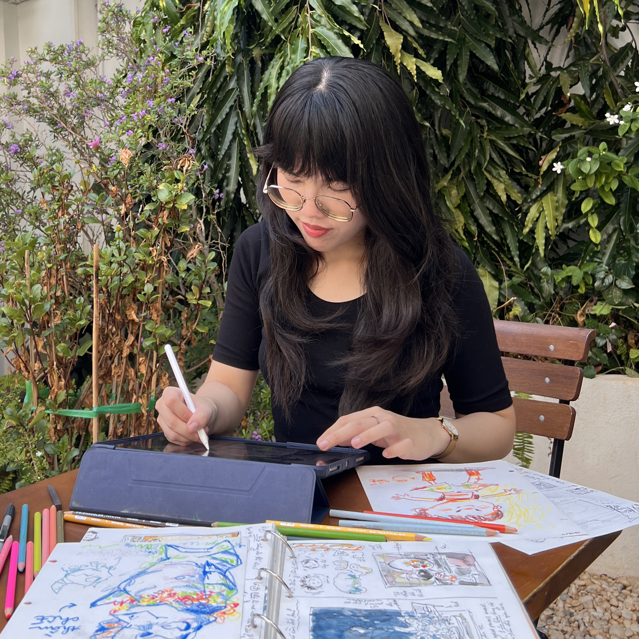 • Trường Thạnh is a visual artist whose work centers on storytelling through illustration. By combining diverse materials and approaches, he develops a mixed-media style that defines his current creative direction.
